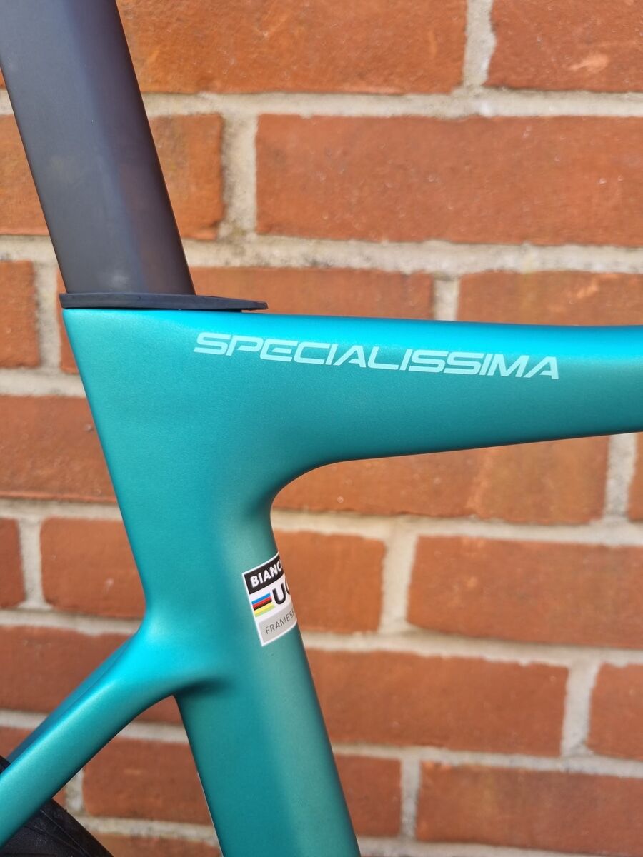 Bianchi Carbon frame with vibration-reducing CV System, this bike ensures unparalleled comfort even on longer rides. The internal cable routing not only enhances the bike's sleek aesthetic but also improves aerodynamics and reduces maintenance. The Shimano Ultegra Di2 electronic shifting provides precise, effortless gear changes, making every ride feel seamless. High-quality Pirelli P ZERO Race tyres provide exceptional traction and handling, while the lightweight Velomann Palladium wheels balance agility and durability for performance-focused cycling.