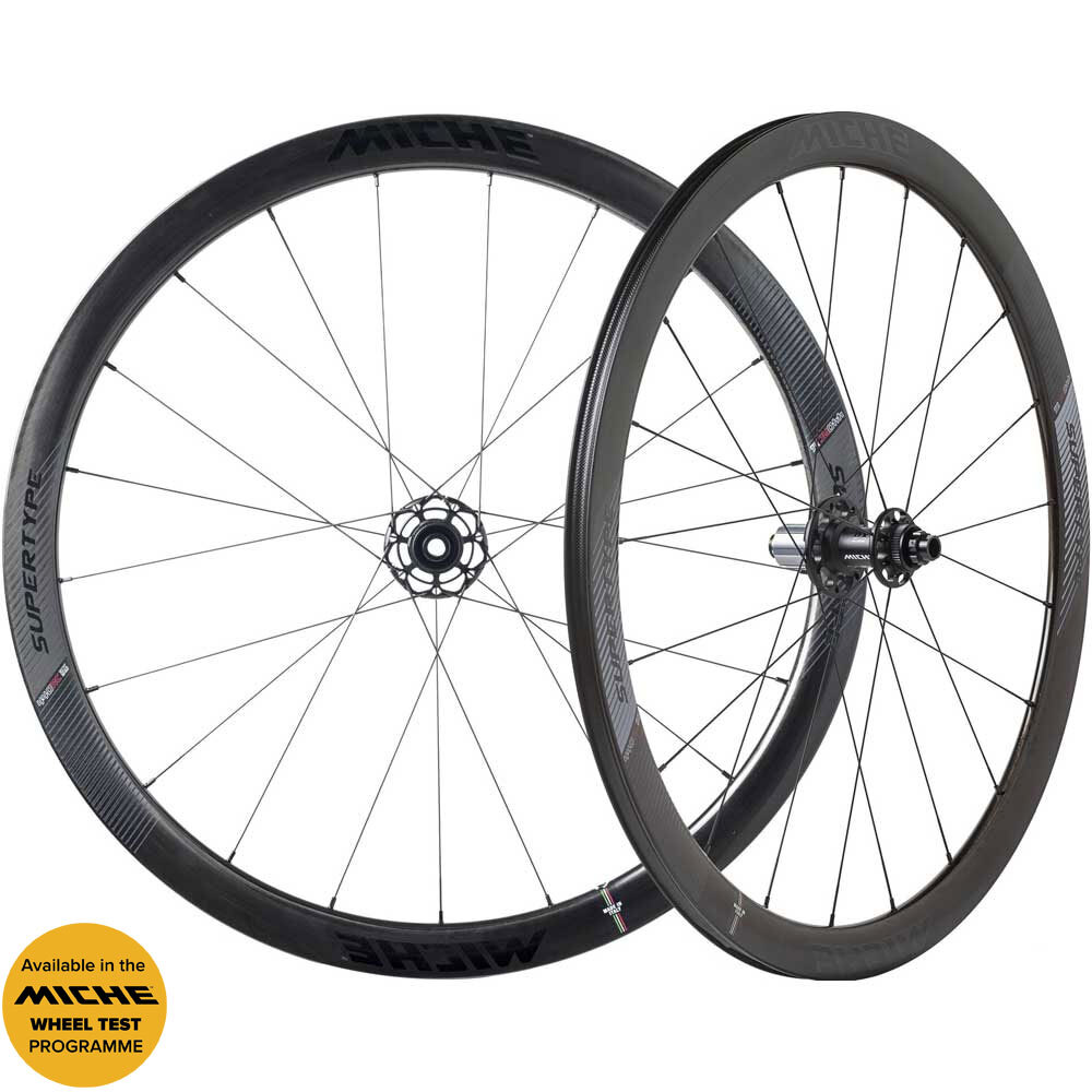| Description | The Supertype wheelsets have always been a staple in the range and for 2019 Miche have taken the name and modernised it for updated trends. The tubeless ready 17c rim section means that it will handle any road tyres no matter the width you want to run. The 40mm rim profile has been developed for maxmimum performance incorporating wind resistance and strength with T-700 unidirectional carbon fibre and HTG resins. The hubs have been made from carbon fibre with CNC AL 7075 T6 over-sized flanges for a lightweight but strong outcome. The Supertype hubs use SKF bearings for precise and long-lasting smooth rolling. **These wheels are covered by a Crash Replacement Scheme offered by Chicken Cyclekit. Please see our [Crash Replacement T&C's](/crashreplacement.php) for details.** **Tech Specs** * Compatibility: CA/SH/SRAM * Hubs: AL 7075 T6/ 3K Carbon * Bearings: SKF Sealed Bearings * Freewheel Body: Titanium * Rims: 3K Carbon Fibre * Spokes: Sapim spokes / Nipples which are specifically manufactured for Miche **Included in the box** * Wheel Bags * Carbon Rim Brake Pads * Valve Extenders * Maintenence and Service booklet * Lockring **Weight** * Front: 658g * Rear: 818g |