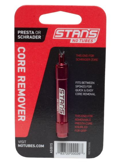 | Description | Removes presta and schrader valve cores. CNC machined, anodized finish with laser etched logo. Fits between spokes for quick and easy core removal. Features knurled end for a no-slip grip. |