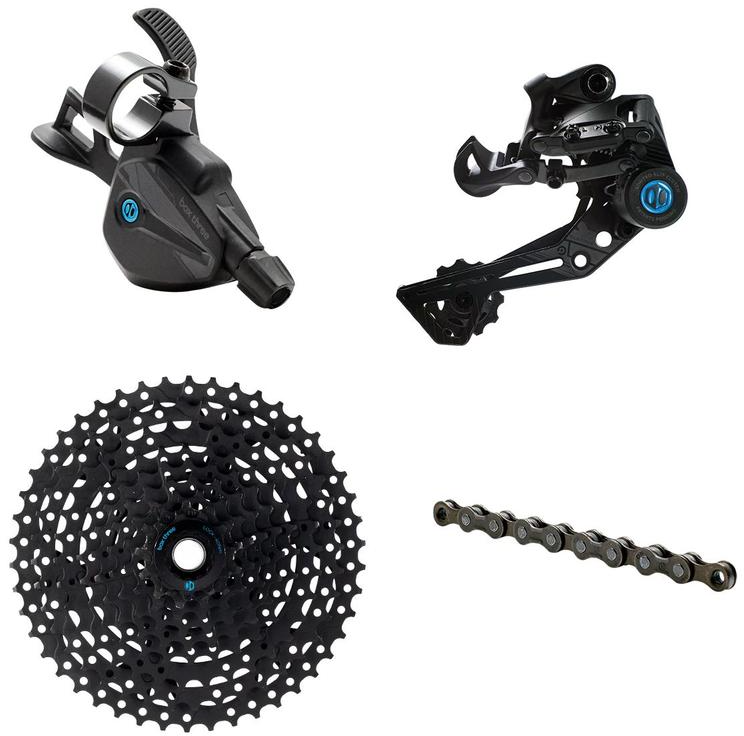 Description Box Three tier delivers many of the same capabilities of its more famous siblings yet it's built upon a simpler platform. Cassettes are accessible at 11-46T or 11-50T and fashioned with steel spiders. The derailleur exploits our Limited Slip clutch technology without the Tri-pack features. Shift easily with a comparable mechanism, although you'll forgo the hinged clamp and die-cast structure. And lastly, string it all together with a Prime 9 chain but without extravagant coatings. If you're looking to bring your 2/3 by bike into the 21st century, then level up with this group