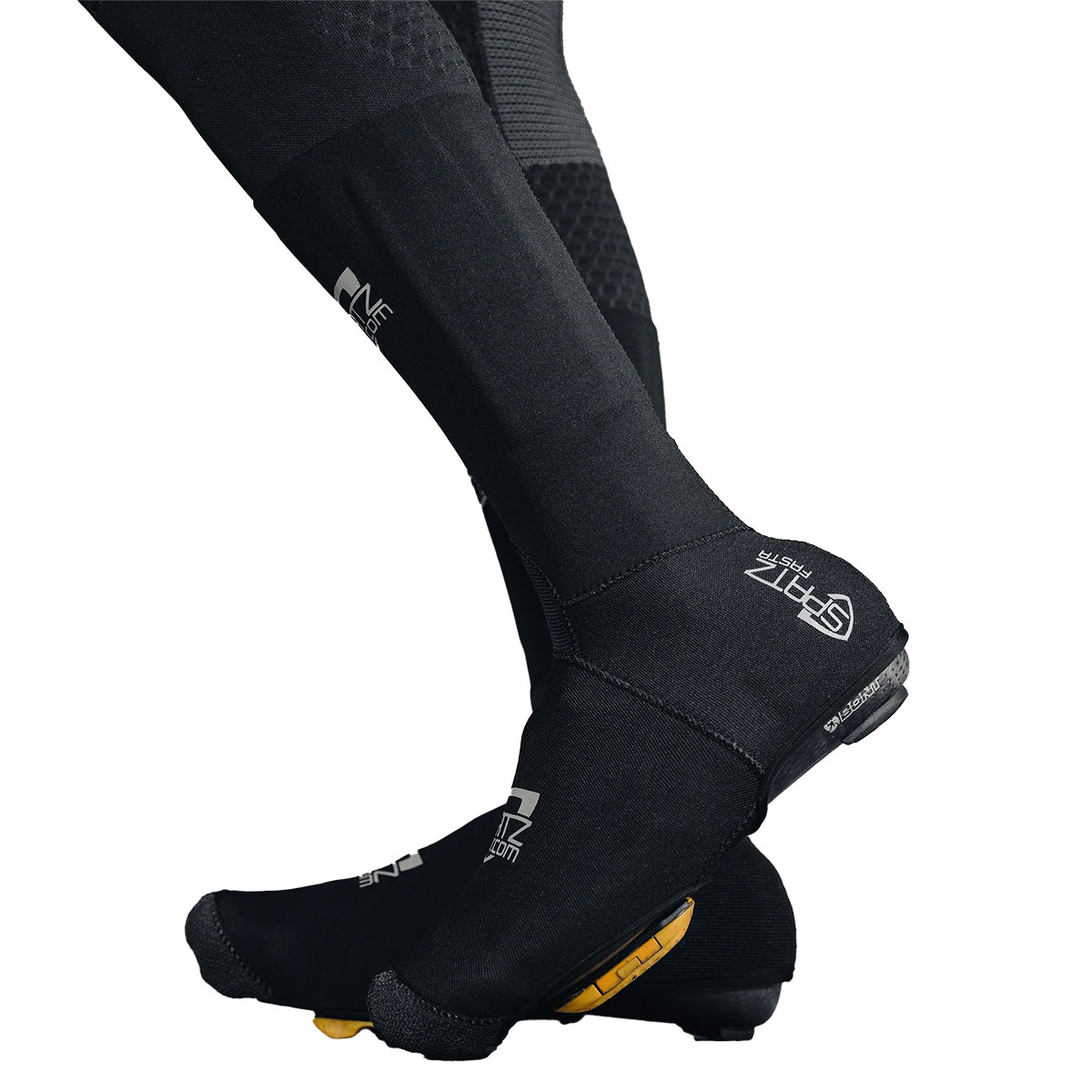 The leg area is designed to form a seamless transition between your leg and the overshoe. 15cm silicone seals run vertically down the leg to form a supple union with your skin or leg warmers/tights. The junction of tights / leg warmers and overshoes is so sleek that it is a challenge to see where the overshoes end and the leg warmers begin…