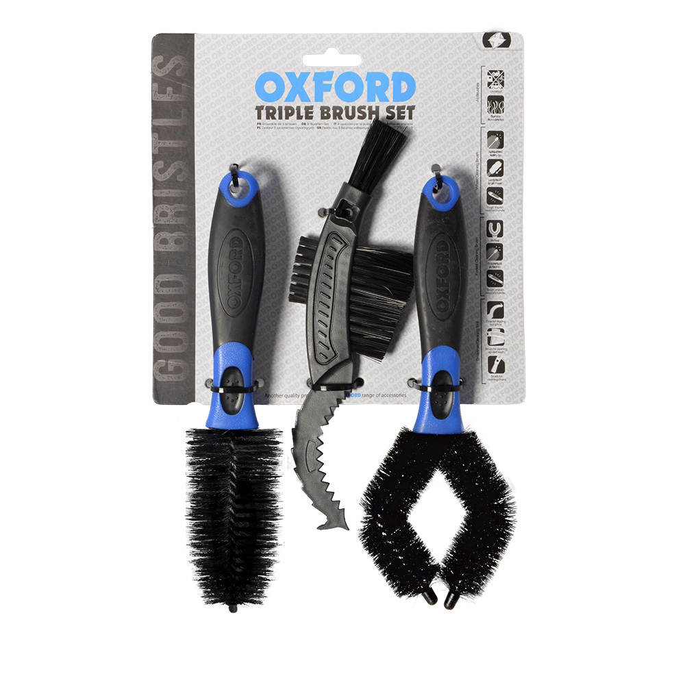 | Description | Oxford's Triple Brush Set triples your cleaning power so you can quickly rid your bike of dirt and grime, leaving you more time to enjoy riding it. Use in combination with our Mint Cleaning & Detailing range to keep your bike minty clean and 'best in show'.The Wheely Clean is a deluxe wheel brush designed to effortlessly clean between spokes and around rims. With three different sized brushes, the Claw Brush is perfect for cleaning drivetrain components and use its moulded claw tool to dig out grime. There's no escape from the Prong Brush as it tackles dirty parts from both sides at once, dislodging hard-to-reach debris with its twin headed design.Key Features• Includes: Wheely Clean, Claw Brush and Prong Brush.• Durable nylon bristles.• Rubberised safety tip.• Long reach brush head.• Tough impact resistant handle.NOTE: To maintain performance of all brushes, avoid use with boiling water and on hot parts. We recommend using warm water and allowing all hot parts to cool before use. "Oxford has managed to distill bike cleaning into the basics and nail it." - MCN Read full review |