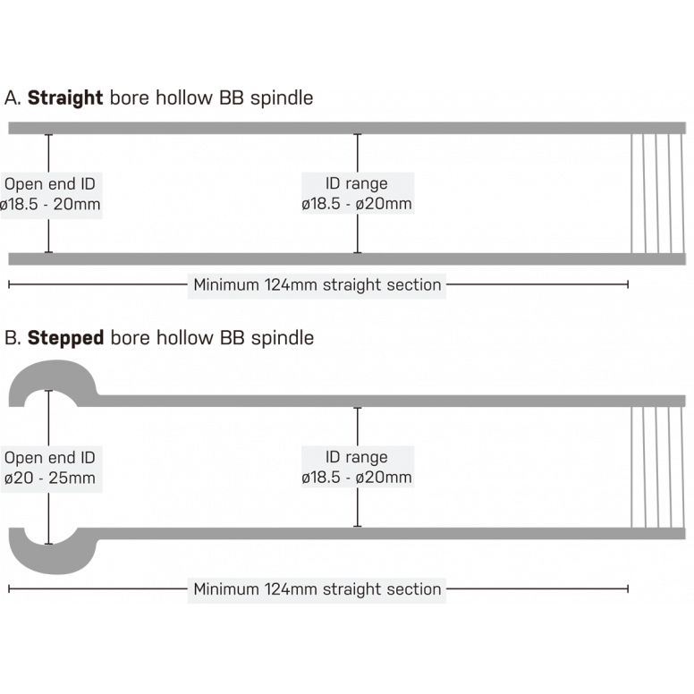- COMPATIBILITY: Hollow BB spindle with minimum 124mm straight section ID range ø18.5 - ø20mm Open end ID range ø18.5 - ø25mmÂ