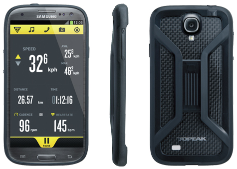 Description The Topeak Samsung Galaxy S4 Ridecase is ideal for all types of riders that want a secure mount for their Samsung Galaxy S4. The protective case features a two tone rear plate with shock-absorbing hard shell and corners to fully protect your phone. Built with a soft, comfortable feel with durable protection, the Topeak case offers a rugged back which provides a solid grip that helps with single handed photo shots whilst your on the move.