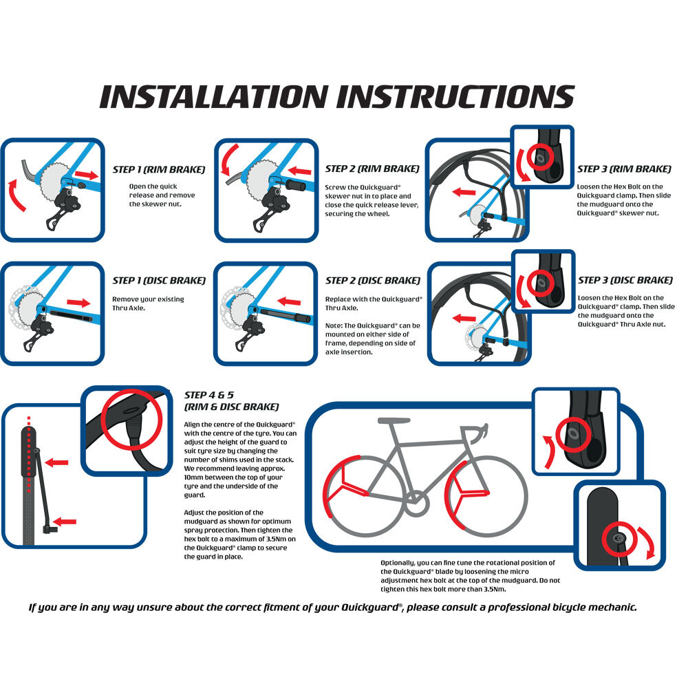 | Description | Single sided easily adjustable and incredibly rigid; The Quickguard has been designed to mount from only one side of the bike using a sturdy & lightweight welded aluminium stay. The Quickguard is suitable for all 700c bikes with tyres up to 32c wide this includes road hybrid and gravel bikes. One of the key features is the is the quick fitting and removal process of the guard. Once initially installed the Quickguard can be mounted and removed in a matter of seconds offering full coverage for the front or rear of your bike. Helping you stay warm and dry while riding solo or during group rides. The unique design allows the guard to only touch your frame at the dropout so no brackets O-rings or pads to scratch your ride making Quickguard ideal for carbon fibre frames or frames without mudguard eyelets. Rattle free from the first installation our unique gimbal washer system is used to perfectly align the height and angle of the guard to your frame and fork. Once installed at the dropout simply remove enough washers to give you approximately 10mm of tyre clearance. Disc Brake compatible with the use of Thru-axles (available separately) where required for any installation or compatibility queries please contact your local Quickguard dealer. **Features:** * 3M Black Reflective Decal for improved night visibility. * Supplied with a 2 Year warranty * Supplied with a Quick Release nut Thru-Axles available separately. * Weight 215g (Including QR Nut) |